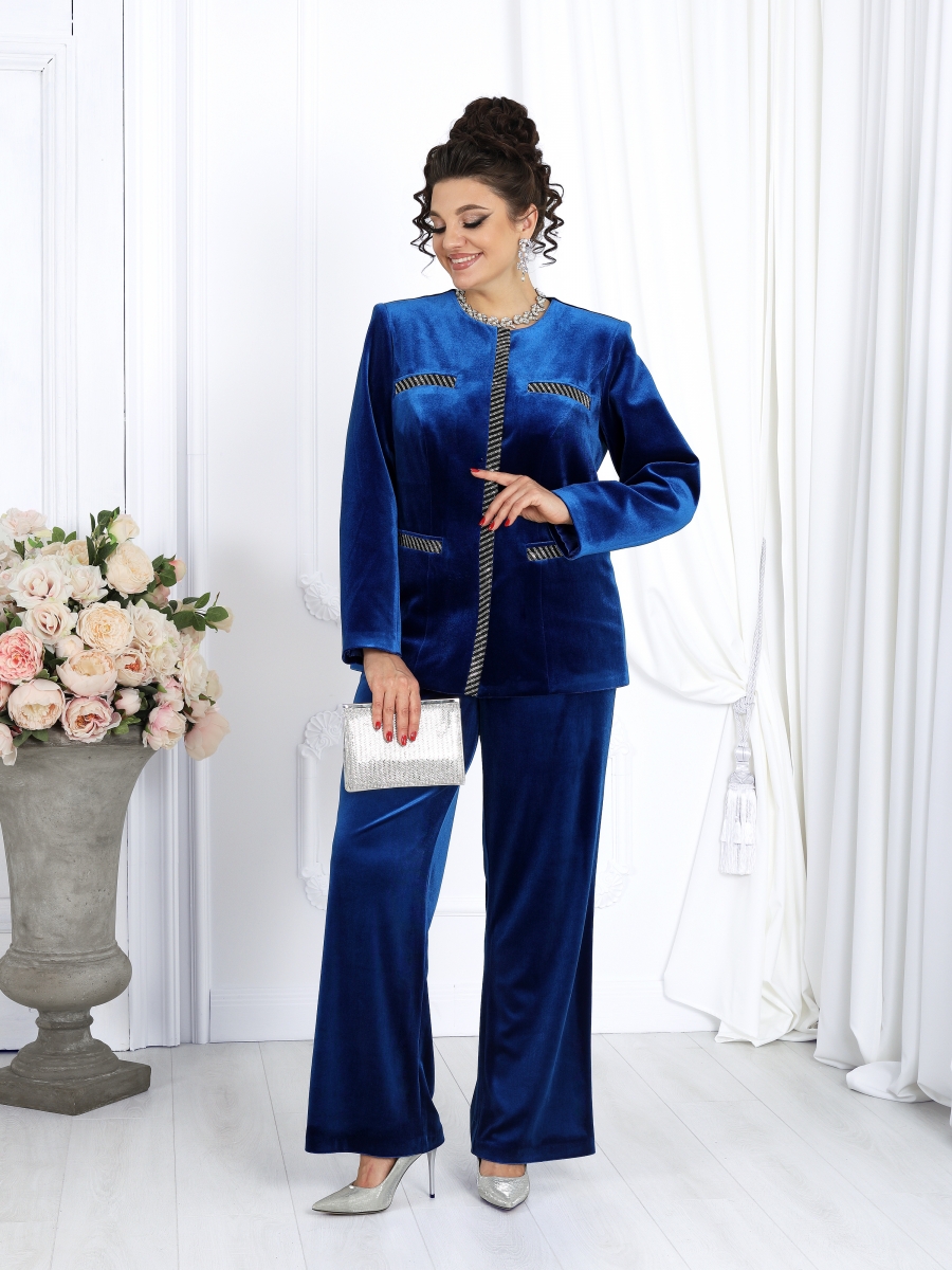 Премиальный костюм, выполненный в роскошном велюре, сочетает классический крой и стильные детали, создавая элегантный образ для делового, офисного или праздничного гардероба. Жакет полуприлегающего силуэта с безупречными линиями рельефных швов подчеркивает фигуру, а декоративная тесьма со стразами добавляет нотку утонченности в стиле Шанель. Застежка на пуговицы скрыта для минималистичного эффекта, а имитация карманов и прорезные карманы придают жакету современный и стильный вид.