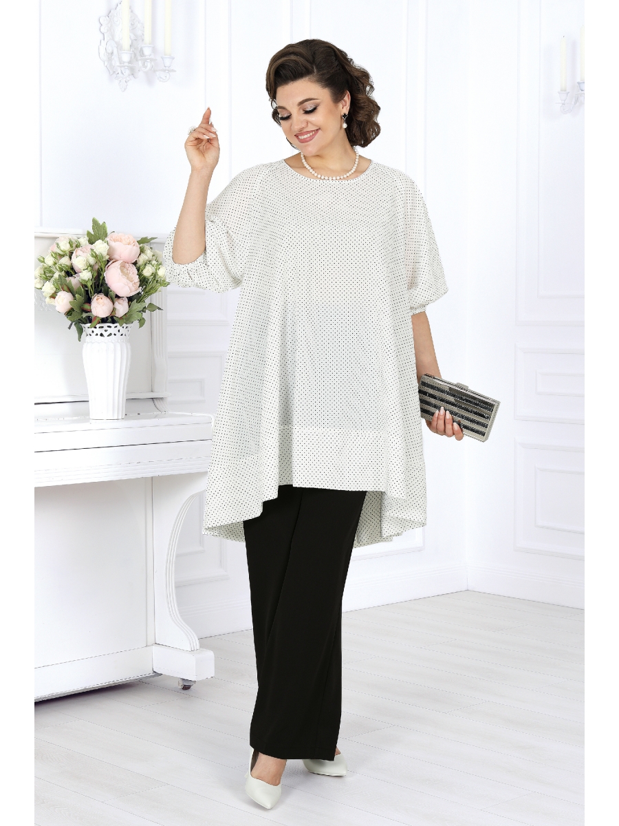 Туника А-образного силуэта, выполнена из платьево-блузочного крепа с принтом «горошек». Модель без подкладки, без плечевых накладок. Низ туники асимметричной формы: укороченный спереди и удлиненный к центру спинки; оформлен двойной притачной планкой. Спинка со средним швом и вырезом «капля», застёгивающимся на декоративную пуговицу и навесную петлю. Горловина круглой формы, спереди углубленная, обработана узкой косой бейкой. Рукав покроя «реглан», сосборен эластичной лентой. Длина туники (спинка) – 97 см; длина рукава (от горловины) – 49 см.