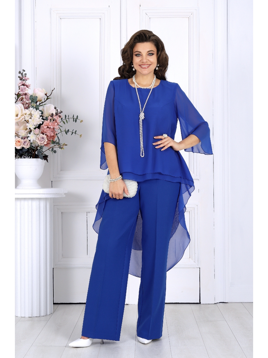 Элегантный брючный костюм – идеальный выбор для вечернего выхода, торжества или особого случая. Легкая шифоновая туника с асимметричным кроем и струящимися рукавами добавляет образу воздушности и утонченности. Удлиненная спинка делает силуэт элегантным и зрительно вытягивает фигуру. Прямые классические брюки из костюмной ткани великолепно садятся по