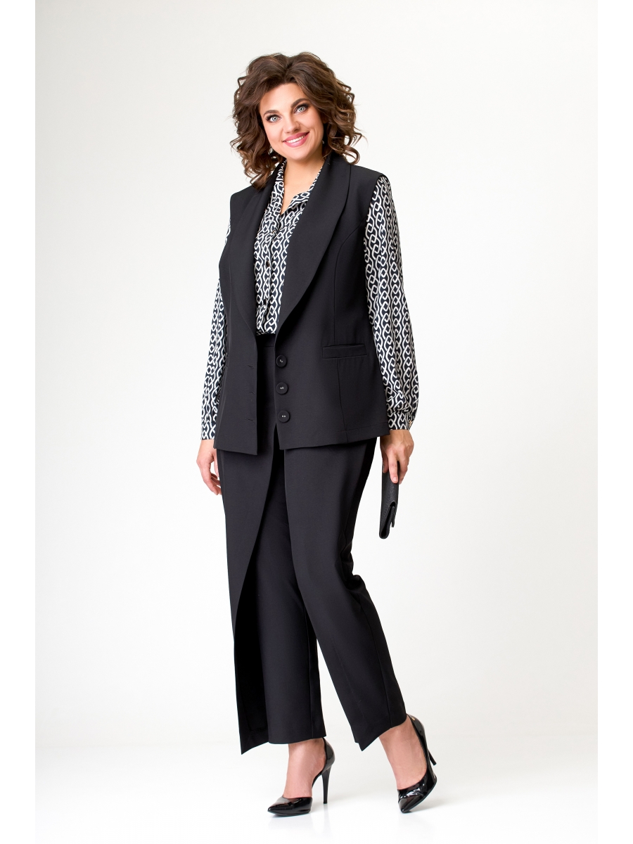 Жилет и брюки выполнены из костюмной ткани. Жилет на подкладке. Перед жилета с рельефами. По линии талии обработаны прорезные карманы с листочками. Воротник - “шаль” жакетного типа. По спинке - средний шов и рельефы. Жилет с центральной застежкой на 3 петли и 3 обтяжные пуговицы.