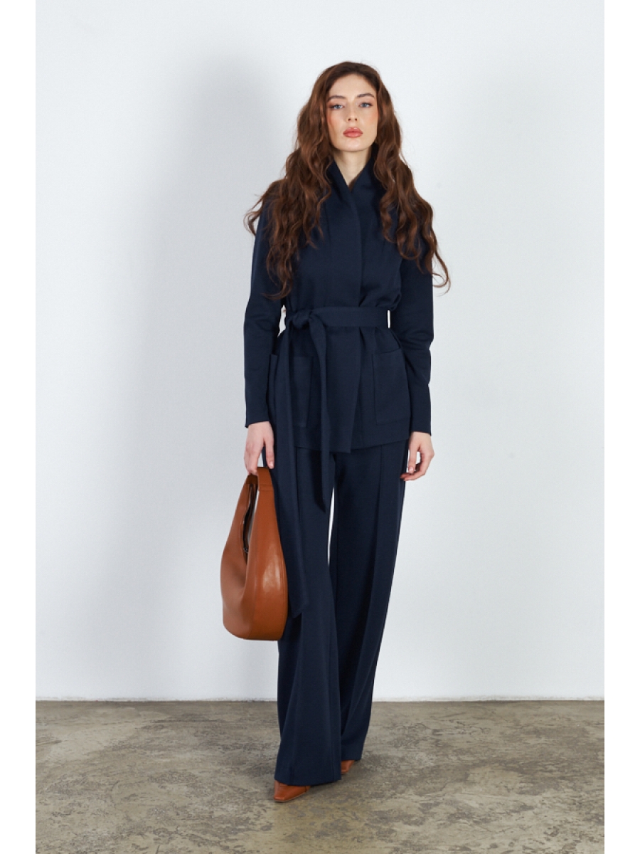 Брюки прямого силуэта. Пояс притачной с эластичной резиной. На передней части брюк застрочены стрелки. Жакет прямого свободного кроя с женственным шалевым воротником и накладными карманами. Втачной длинный рукав. В комплекте пояс из основной ткани, позволяющий создавать приталенный силуэт.