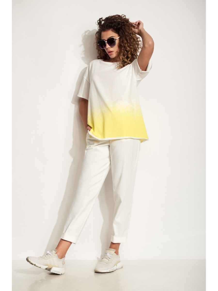 Футболка женская, свободного силуэта. Лимитированная партия эко футболок из высококачественного хлопка с дизайнерской печатью в итальянской технике «Градиент». Футболка прямого кроя с круглой горловиной. Горловина, рукав и низ футболки обработаны открытым срезом. Брюки в стиле «чинос» из хлопкового турецкого джинса. Брюки с регулируемыми отворотами по низу, пояс на шлевках, сзади накладные карманы. В комплекте к брюкам прилагается пояс-стропа.
