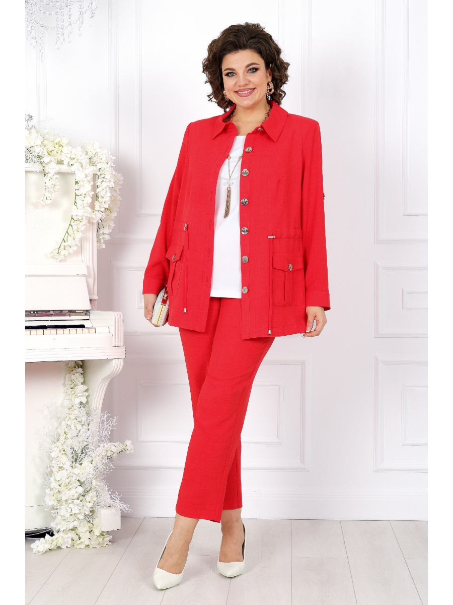 Комплект брючный 3-х предметный, состоящий из жакета и брюк, выполненных из ткани лен-вишер, и джемпера, выполненного из трикотажного полотна.