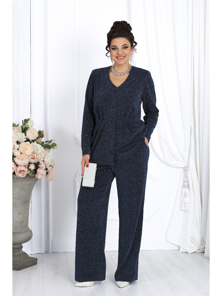 Элегантный брючный комплект – идеальный выбор для праздника, вечера в ресторане или важного мероприятия. Жакет с выразительным V-образным вырезом и аккуратными складками по линии талии подчёркивает женственный силуэт, а сияющая ткань с люрексом придаёт образу динамику и мягкость, создавая гармоничное сочетание классики и современности.