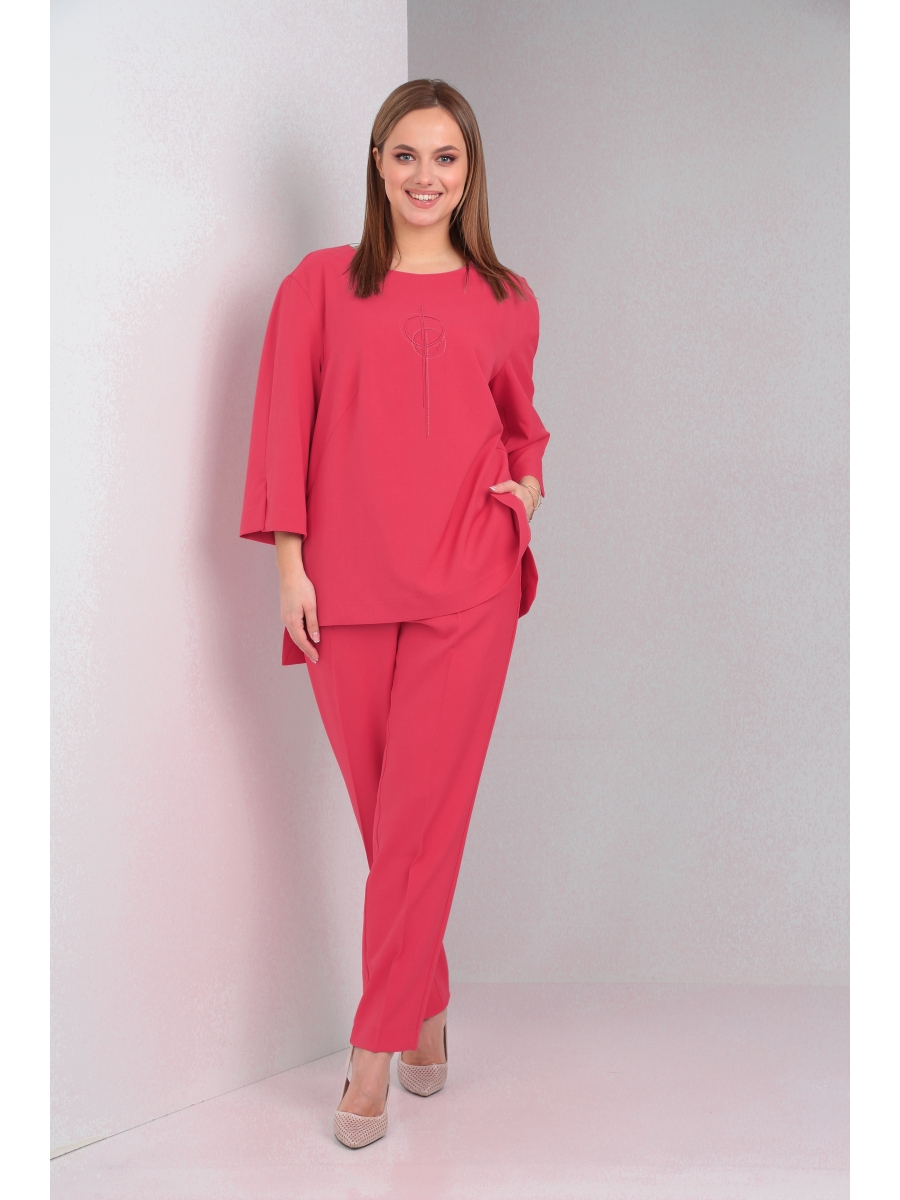 Комплект женский выполнен из плательно-костюмной однотонной ткани, состоит из брюк и блузона. Брюки слегка зауженные к низу на притачном поясе с резинкой. В боковых швах имеются функциональные карманы.
