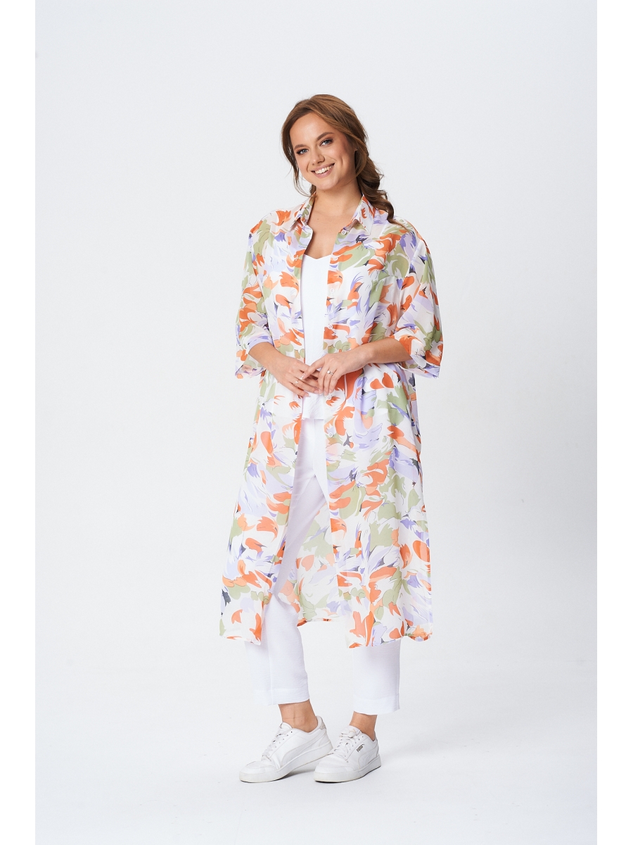 Шазюбль прямого силуэта свободного покроя из плательно-блузочной ткани шифон с принтом. По переду центральная застежка на петли и пуговицы, нагрудные вытачки из проймы, в боковых швах высокие разрезы. По спинке кокетка, складка. Воротник рубашечный на стойке. Рукав втачной, линия плеча спущена.
