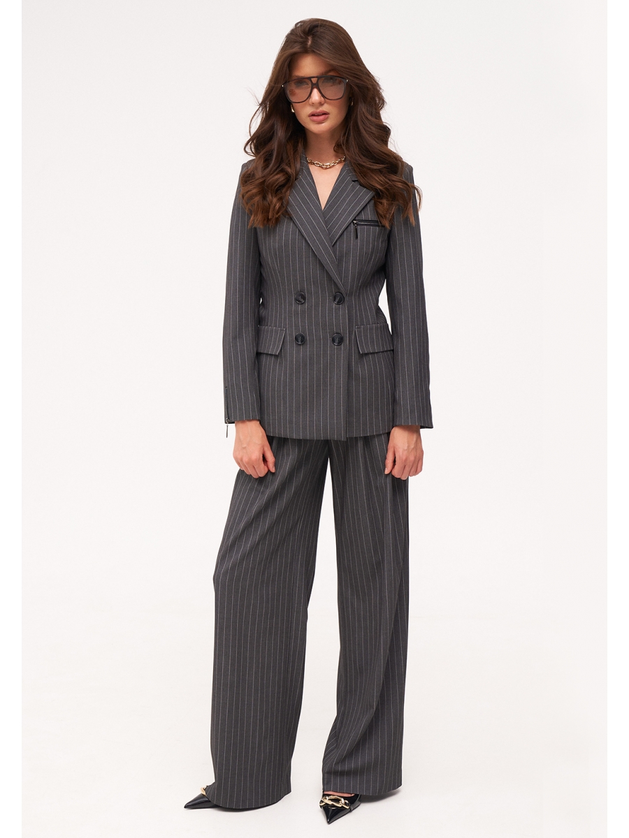 Двубортный жакет полуприлегающего силуэта с декоративными элементами ввиде молнии со входом в карман на груди и молнией по низу рукава. По переду два настрочных клапана. Сзади шлица.