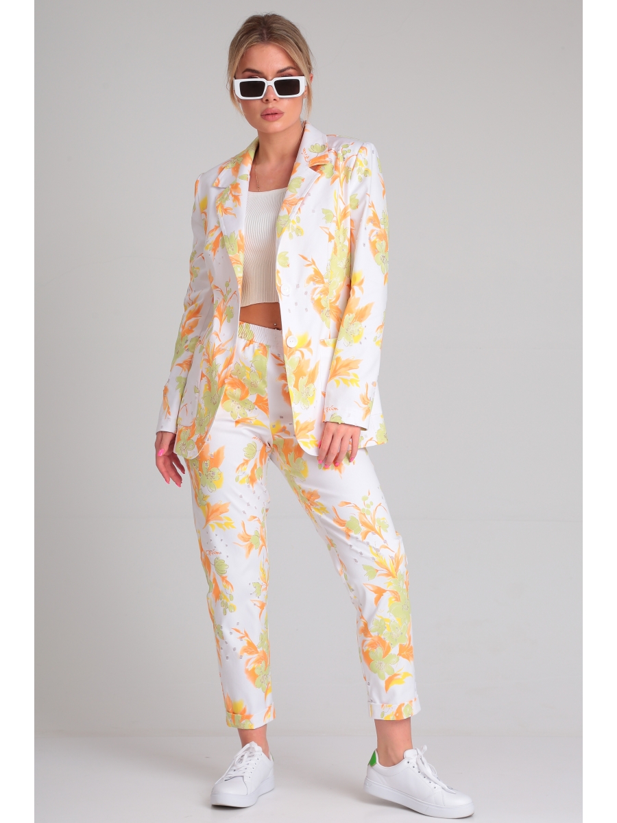 Яркий и эффектный двухпредметный женский комплект состоит из классического жакета и удобных брюк. Комплект выполнен из принтованной хлопковой ткани, которая не сковывает движения и идеальна для теплой погоды.