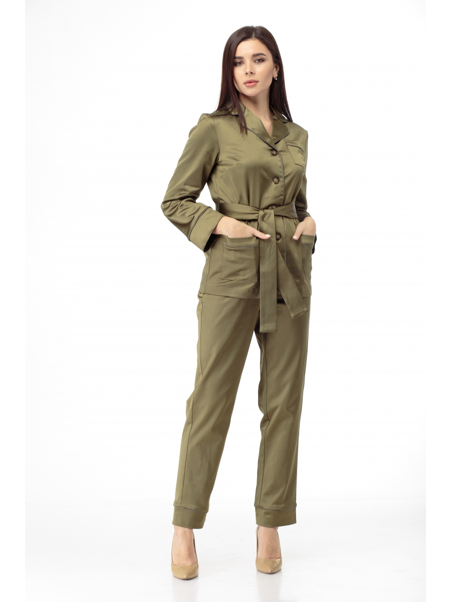 Элегантный воротник пиджачного типа, притачные манжеты по низу рукавов и низу брюк с отделкой кантом придают изделию особый изыск.
