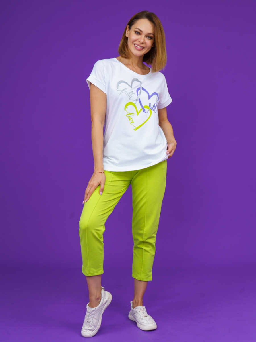 Модель состоит из футболки и брюк-капри. Футболка свободного силуэта с округлой горловиной, цельнокроеным рукавом.