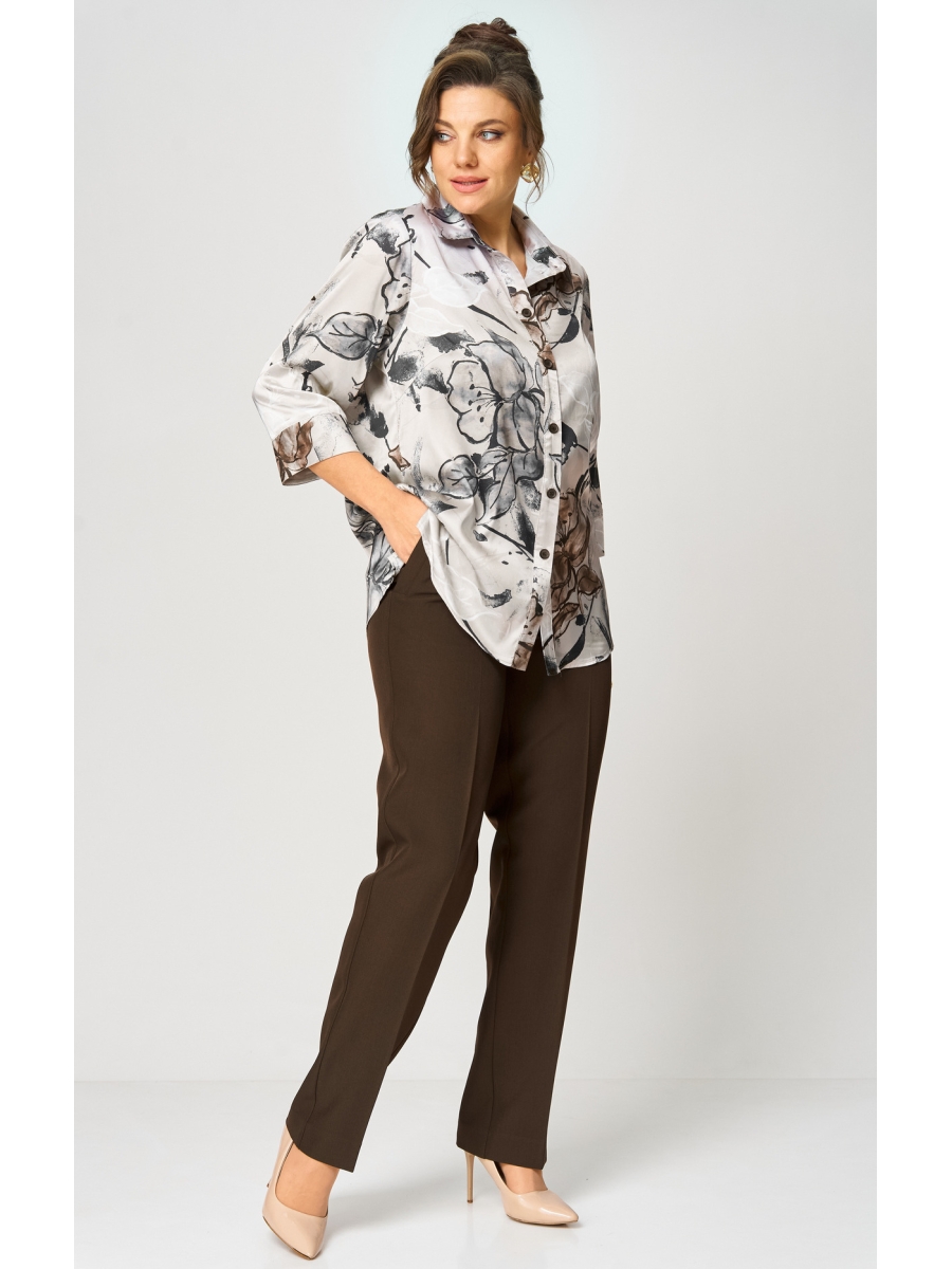 Верх: блуза прямого кроя из нежного текстиля. Рукава 3/4 с манжетами и отложной воротник дарят образу лёгкость и утонченность. Центральная застежка на пуговицы и боковые разрезы добавляют практичности.