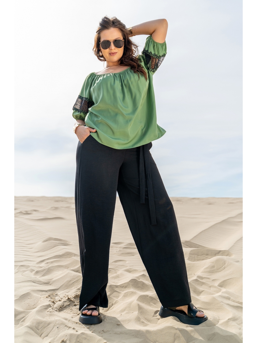 Блузка с рукавами покроя ""реглан"", горловина блузка с эластичной резинкой, что позволяет носить блузку на плечах и с открытыми плечами. Рукава реглан, свободные 3/4, по низу с эластичной резинкой.