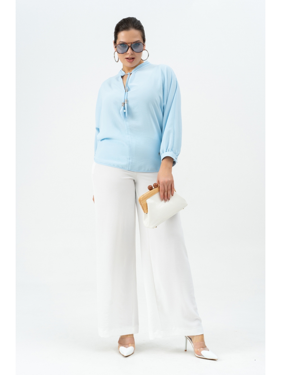Блузка женская как для праздников так и для любого повода, покроя "летучая мышь", со стойкой на которую настрочена завязка с декоративными элементами, со швом по центру полочки, рукава цельнокроеные, застёгивающиеся на петлю и пуговицу. Низ блузки по спинке длиннее, по полочке короче.