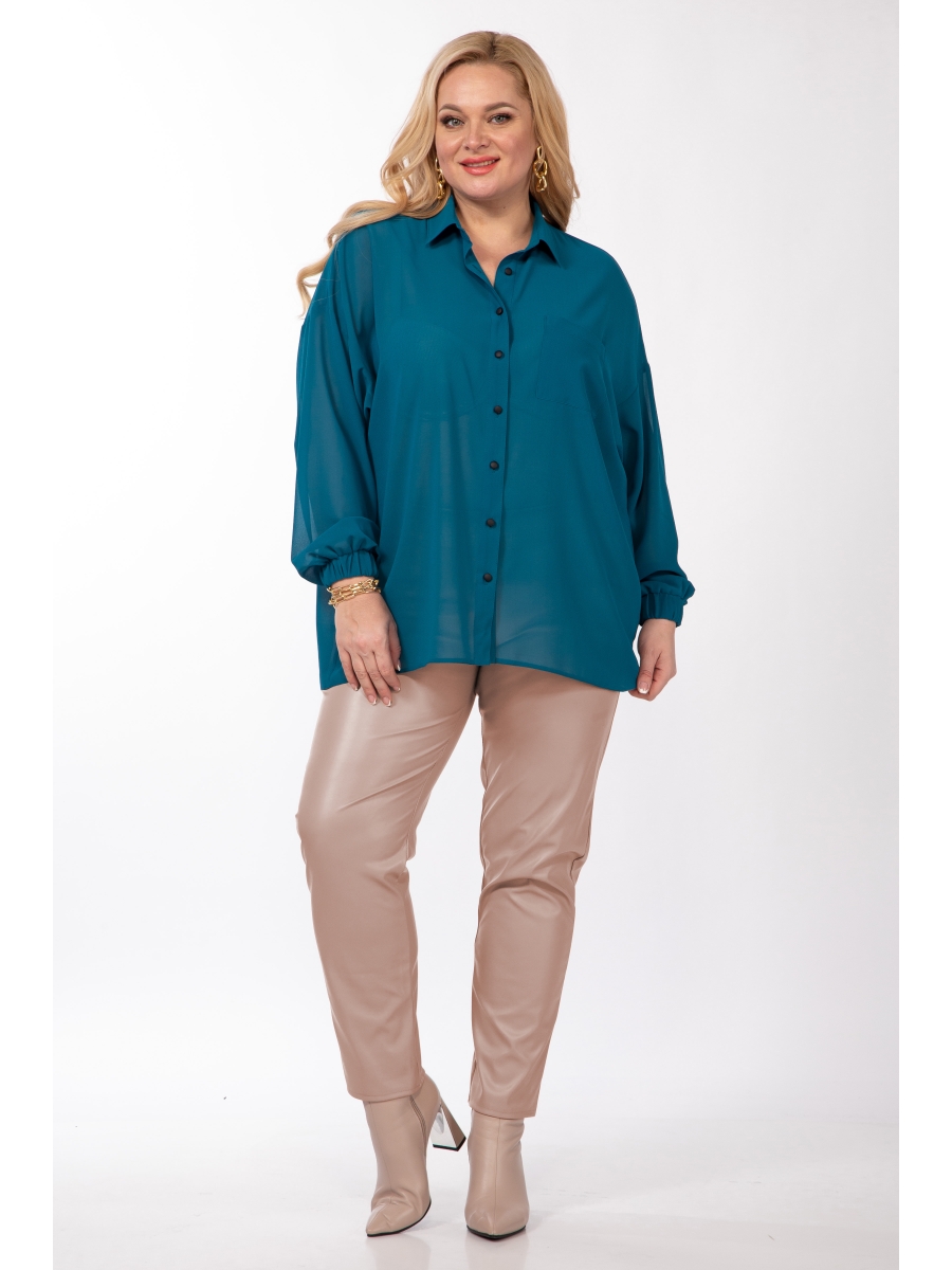 Комплект женский 2-х предметный (блузка, брюки).Блузка женская, прямого силуэта, из шифоновой ткани со спущенным плечом. Застежка модели на планку и пуговицы, воротник на стойке, по полочке идет накладной карман, манжет рукава на резинке. Брюки из ЭКО-кожи зауженные к низу, пояс на резинке, по бокам карманы.