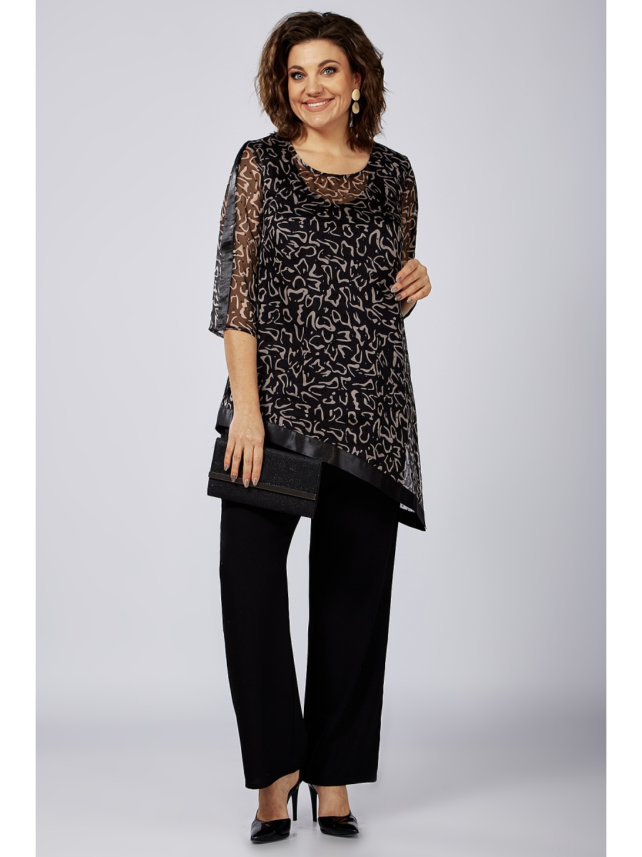 Мягкий, красивый стильный и очень комфортный женский костюм большого размера, состоящий из блузы и брюк прямого силуэта. Брюки выполнены из костюмно-плательной ткани, пояс на резинке. Блуза выполнена из шифона на трикотажной подкладке. Блуза сложного геометрического кроя с удлиненным боковым швом и разрезом . Низ изделия обработан отделочной тканью. Рукава длинной чуть ниже локтя.Необычное дизайнерское решение на стыке безупречной женственности и стиля с динамикой и новаторством подчеркнет изысканный вкус обладательницы, не лишив комфорта и функциональности. Пойдет как офисная одежда, а так же как вечерний наряд, как праздничный для вечернего выхода. В больших размерах легкий оверсайз.