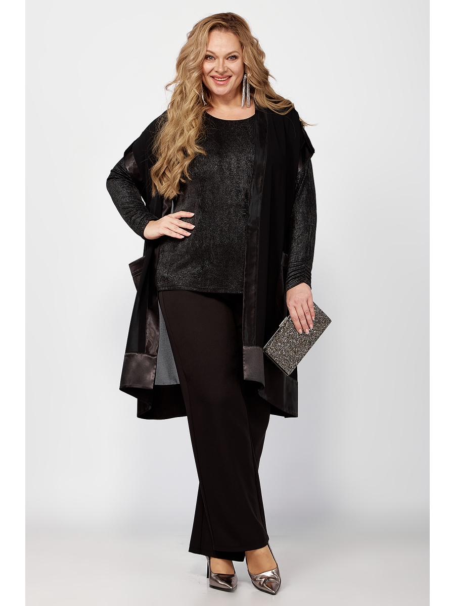 Вы ищете стильный и современный костюм для корпоратива, Нового года, Рождества или Дня рождения? У нас есть идеальное предложение для Вас - костюм-тройка большого размера, который состоит из кардигана, брюк и ,блузы с длинным рукавом. Вся одежда изготовлена из ткани, обладающей высоким качеством. Важно отметить, что наш комплект-тройка доступен в больших размерах, модель подчеркнет Ваши достоинства и сделает Вас неподражаемой на любом мероприятии и повседневной жизни. Брюки прямого силуэта, на резинке не будут сковывать движения. Кардиган выполнен в сочетании двух тканей: шифона и атласа, со спущенной линией плеча. На полочке обработаны накладные карманы, декорированные патой на петлю и пуговицу. Лонгслив изготовлен из тонкого трикотажного полотна с блестящим напылением. Блуза идеально смотрится с чем-угодно – важно только Ваше чувство стиля и погода за окном. Такой комплект просится в Ваш гардероб!