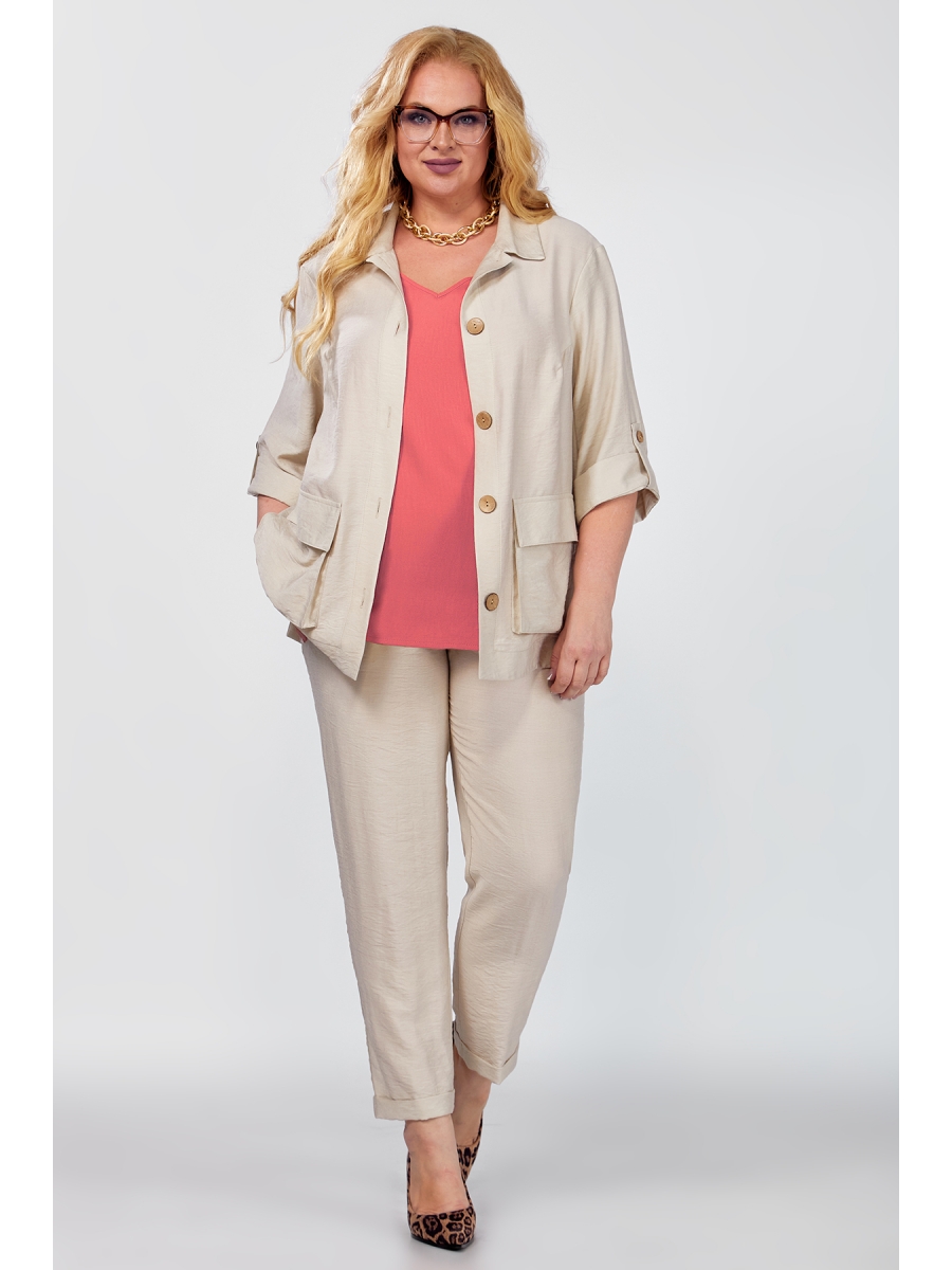 Стильный женский комплект-тройка ALGRANDA: рубашка-жакет с брюками и созвучной майкой – это стильное и комфортное решение для женщин больших размеров, идеальный выбор для тех, кто ценит комфорт и стиль. Модель выполнена из ткани из натурального волокна - хлопка с добавлением полиэстера и эластана, что позволяет чувствовать прохладу в жару, она прекрасно сидит на фигуре, обеспечивая свободу движений и приятные тактильные ощущения. Жакет свободного прямого кроя со спущенными рукавами, застегивается на 5 пуговиц и дополнен двумя накладными карманами, по боковым швам обработаны разрезы, низ жакета асимметричный. Блуза с рукавом «крылышко», горловина углубленная V-образной формы, на правом боковом шве есть декоративная нашивка. Брюки-бананы с отложными манжетами и боковыми карманами обеспечивают удобную посадку. Свободный крой комплекта позволяет носить его как в офисе, так и в повседневной жизни. Модель представлена в широком размерном ряде, что делает ее доступной для женщин с любыми параметрами. Это идеальный женский костюм как для прогулки, так и для похода в офис.