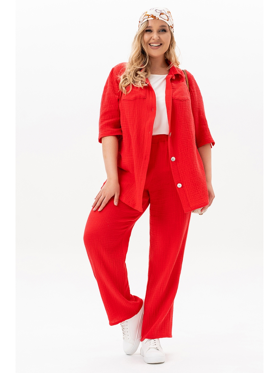 Ищете идеальный костюм, который сочетает в себе комфорт и стиль? Обратите внимание на наш женский брючный костюм из муслиновой ткани! Этот комплект станет Вашим незаменимым спутником как для домашнего отдыха, так и для прогулок на свежем воздухе. Изготовленный из 100% хлопка, он обеспечивает отличную воздухопроницаемость и легкость, что особенно актуально в жаркие летние дни. Муслин — это дышащий материал, который быстро сохнет, что делает его идеальным выбором для активных женщин. Вы сможете не беспокоиться о стирке, ведь этот комплект легко стирать и он не требует особого ухода. Костюм представлен в универсальном дизайне, который подойдет для любого повода. Стильный, яркий цвет добавит яркости в Ваш гардероб. Брюки на резинке с карманами-хулиганами в боковых швах. Силуэт брюк прямой. Рубашка дополнена накладными карманами по переду и кокетками на спинке и полочке. Перед и спинка рубашки - разноуровневые. Рукав с увеличенной линией плеча, длиной до локтя и с небольшими разрезами. На полочке пришиты пуговицы из натуральной ракушки.