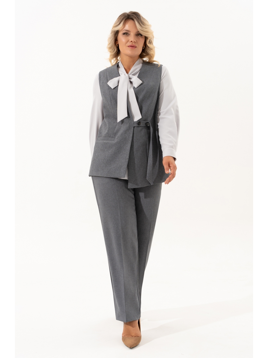 Костюм женский классический это идеальное решение для Вашего гардероба. Комплект  состоит из двух предметов - прямые брюки с высокой посадкой прямого кроя на молнии и на резинке, с боковыми карманами сочетаются  с любыми базовыми вещами. Универсальный классический жилет с V-образным  вырезом горловины превосходно садится по фигуре, на правой полочке обработан прорезной карман с листочкой, на левой разрез , застежка обработана  на отлетном хлястике ,на петлю и пуговицу.  Этот элемент делает  его более интересным. Жилет на подкладке . Ассиметричный жилет можно одевать поверх тонкой одежды. Базовый брючный костюм идеален для повседневного образа на работу в офис,школу, а при нарядной блузке  комплект превращается  в нарядный.  Современный  костюм  также будет хорошо смотреться как вечерний наряд на различные мероприятия, праздники, день рождения, корпоратив. Шикарный нарядный станет незаменимым в Вашем гардеробе . Этот костюм  подчеркнет Вашу уверенность и стиль.