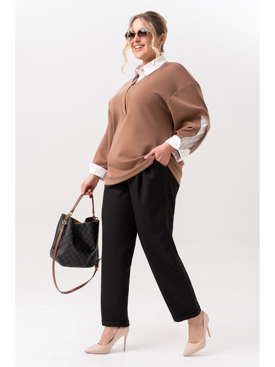 Практичный и удобный – он станет Вашим любимым костюмом, а трендовый дизайн делает его актуальным решением для девушек, которые следят за модой. Свитшот женский с имитацией рубашки- новинка коллекции. Изготовленный из качественного трикотажа и полоски на х/б основе, он обеспечивает дышащие свойства и гипоаллергенность, что особенно важно для женщин с чувствительной кожей. Подходит на осень, весну и для зимы. Ткань необычайно мягкая и приятная к телу. Свободный оверсайз крой изумительно подойдет для девушек и женщин больших размеров. На свитшоте обработан воротник и застежка –планка на петли и пуговицы. Рукав комбинирован из двух тканей, с манжетой и разрезом. Модель подходит для высоких и для невысоких. Брюки с удобной ,высокой посадкой и боковыми карманами позволяют хранить мелкие вещи, такие как ключи или смартфон, что делает этот костюм не только стильным, но и практичным. По низу брюк обработаны манжеты. Пояс частично на резинке, застежка на молнию и петлю с пуговицей.