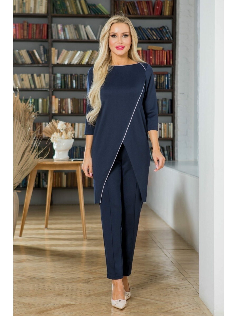 Стильная туника с эффектом запаха. Выполнена из плотного трикотажного полотна. Расцветка темно-синий. Декорирована кантом. Горловина оформлена вырезом лодочка. Низ прямой. Без застёжки. Без подклада. Отлично впишется в ежедневный гардероб, а так же подойдет как офисный вариант. Рекомендуемая стирка при t не более 30.