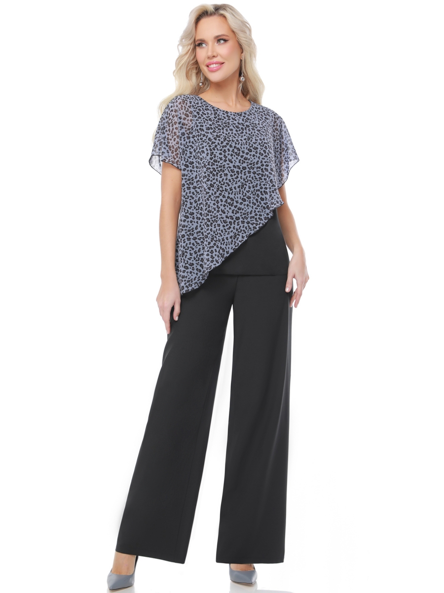 Роскошный брючный костюм— нарядная модель оригинального дизайна. Комбинированная блузка с коротким рукавом и округлым вырезом прекрасно смотрится на любой фигуре. Но ее главный акцент — асимметричная пелерина. Необычный дизайн помогает скрыть нюансы в области талии. Брюки прямого кроя на резинке придают костюму элегантности, визуально удлиняют силуэт и стройнят. Остается дополнить наряд остроносыми лодочками на каблуке и парой акцентных украшений, чтобы стильно завершить образ.