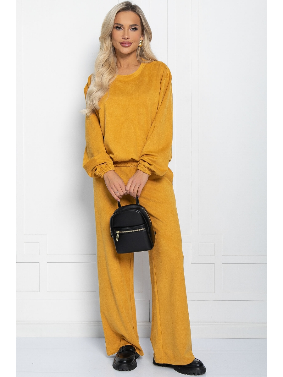 Спортивный костюм горчичного цвета – это идеальное сочетание комфорта и стиля для активного образа жизни. Изготовлен из высококачественных и дышащих материалов, он обеспечивает отличную вентиляцию и свободу движений. Брюки свободного прямого края с карманами в боковом шве, пояс на резинке. Свитшот свободного кроя, со спущенным плечом, округлый вырез горловины обработан планкой, по низу рукава и изделия манжет на резинке. Рукав втачной.
