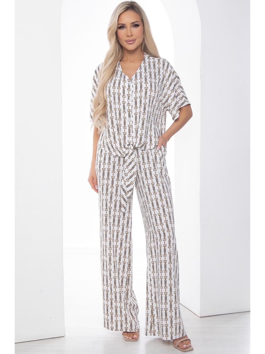 Костюм из лёгкой ткани, состоящий из свободной рубашки и брюк, идеально подойдёт для летнего расслабленного образа. Свободный крой не сковывает движений и дарит комфорт. Карманы в боковых швах у брюк. Рубашка застёгивается на пуговицы.