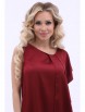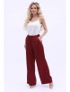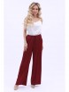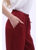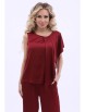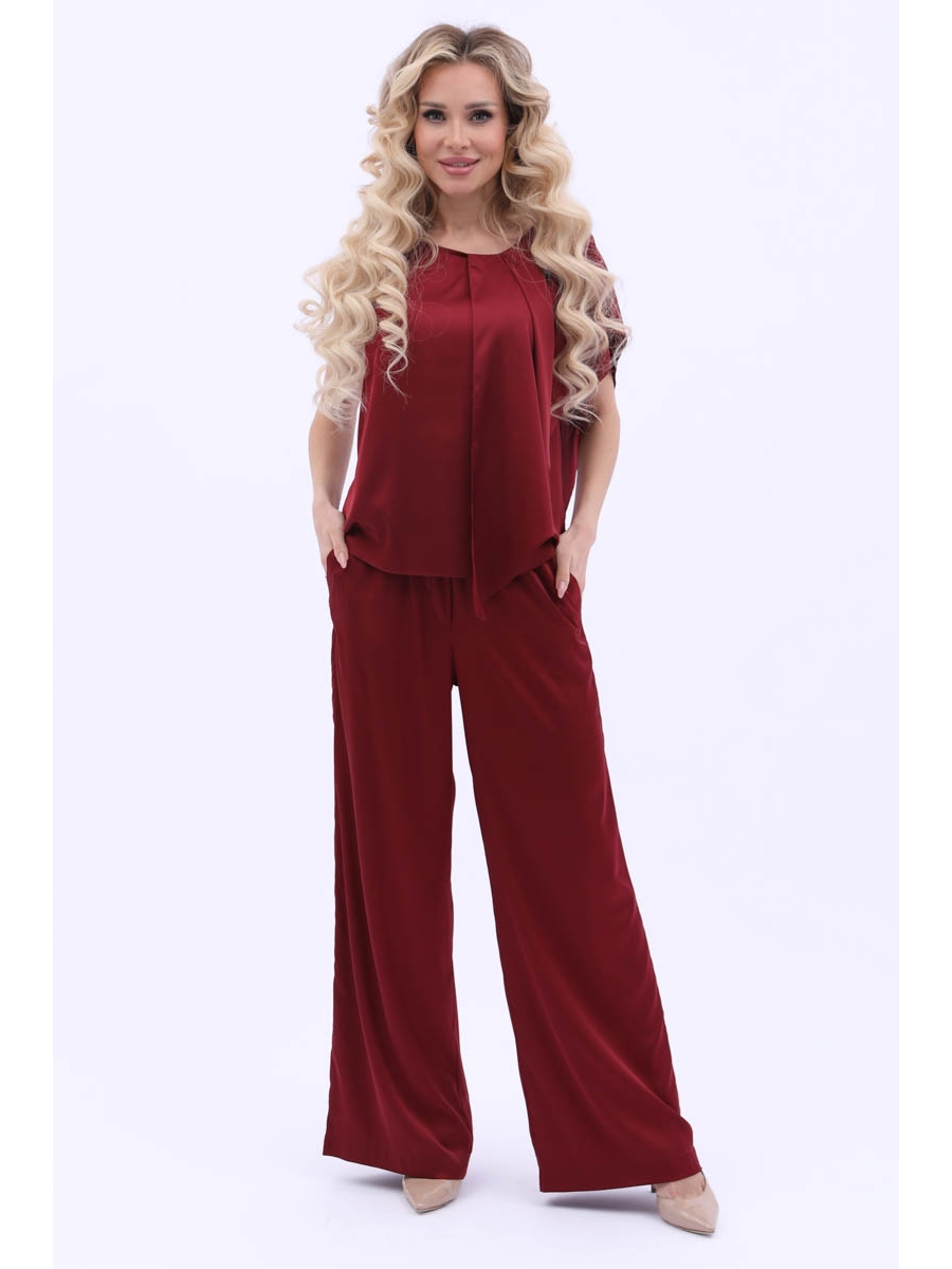 Элегантный костюм из текстильного полотна бордового цвета. Круглый вырез блузки обработан внутренней бейкой. По переду блузки выполнены декоративные складки и широкая оборка. Верхняя часть брюк обработана поясом с резинкой. Брюки дополнены карманами. Длина блузки по спинке от плечевого шва до низа изделия — 60 см. Дина брюк от пояса до низа изделия — 105 см. Рост фотомодели — 170 см.