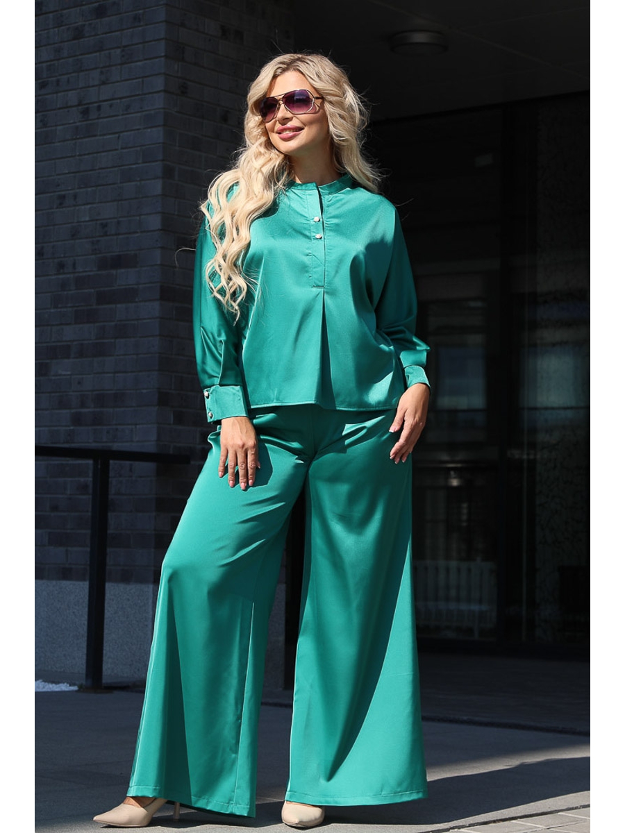 Роскошный костюм прямого силуэта из плотного атлас зелёного цвета. Вырез обработан воротником - стойка и и дополнен планкой с застежкой на пуговицы. Блузка с цельнокроеными рукавами, по низу рукавов широкие манжеты с застежкой на пуговицы. Верхняя часть брюк обработана поясом с резинкой. Длина блузки по спинке от плечевого шва до низа изделия — 70 см. Длина брюк от пояса до низа изделия — 106 см. Рост фотомодели — 170 см.