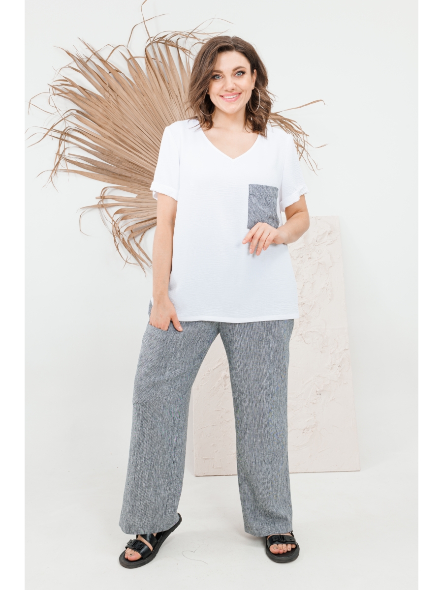 Футболка свободного силуэта. Горловина с V-образным вырезом. Рукав вточной, к низу на подгибке. В боковых швах футболки разрезы. На полочке слева декоративный карман из контрастной ткани в тон брюк.