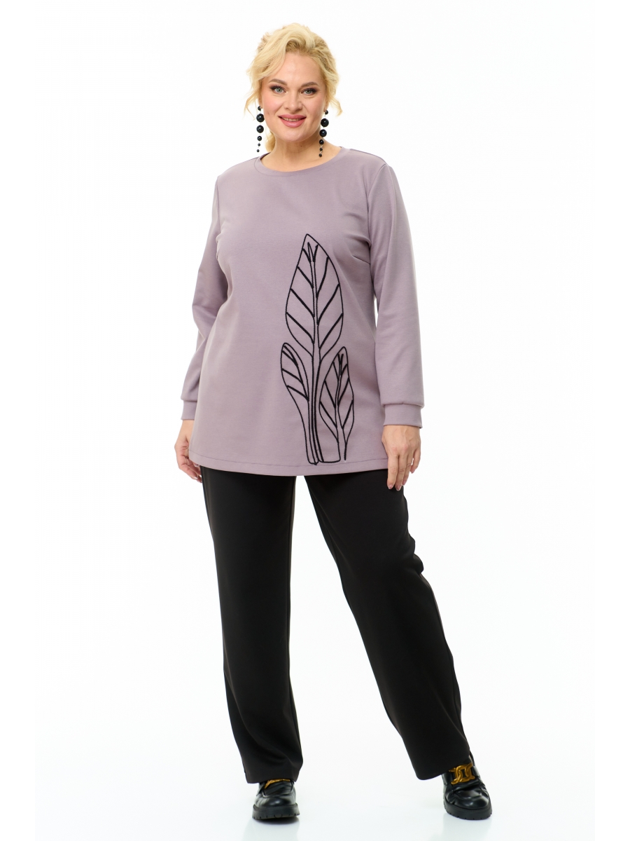 Джемпер свободного покроя с круглой горловиной. Рукав втачной, полномерный по обхвату, на манжете. По переду авторская вышивка декоративным шнуром «Листья». Для удобства в боковых швах разрезы.