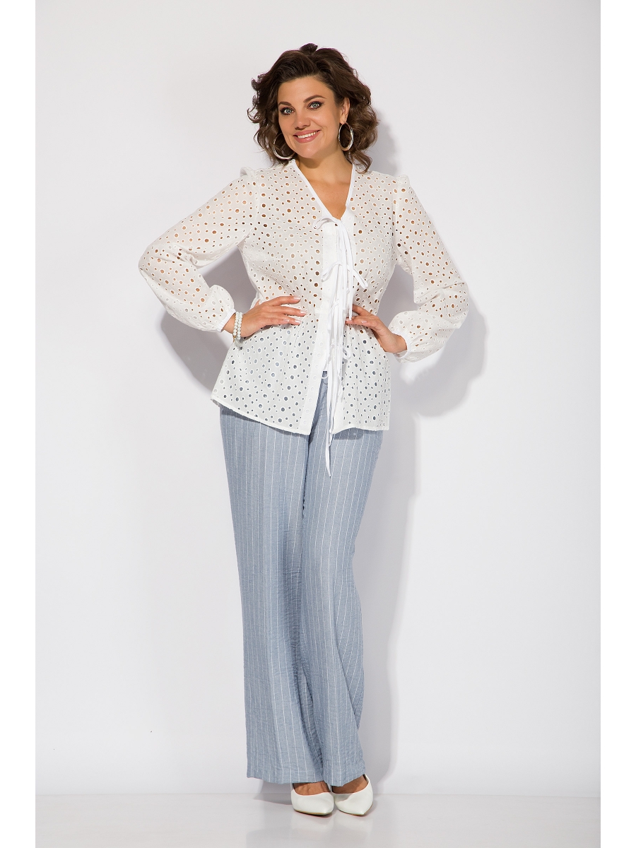 Романтическая женская блузка из 100% хлопка с вышивкой «ришелье». Модель с V-образным вырезом горловины, с застежкой встык на декоративную завязку. По линии талии блузка отрезная, с легкой сборкой по низу. Рукав вточной, полной длины, присборен по низу на резинку. Данная блузка оставит гармоничный комплект с прямыми брюками в продольную полоску.