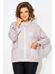 Модель свободного силуэта, с рукавом длиной ¾-ти на спущенном плечевом поясе. Горловина обработана полулежащей стойкой. Застежка центральная на молнию. По полочке расположены аккуратные накладные карманы. Низ изделия оформлен притачной планкой. Изюминкой данной моделям служит необычные паты по рукаву с завязкой в виде банта. Этот вязанный трикотажный жакет - идеальный вариант для создания стильного и привлекательного романтического образа! Мягкий и нежный материал делает его очень приятным на ощупь, теплым и уютным, а легкое мерцание придает свою изюминку.