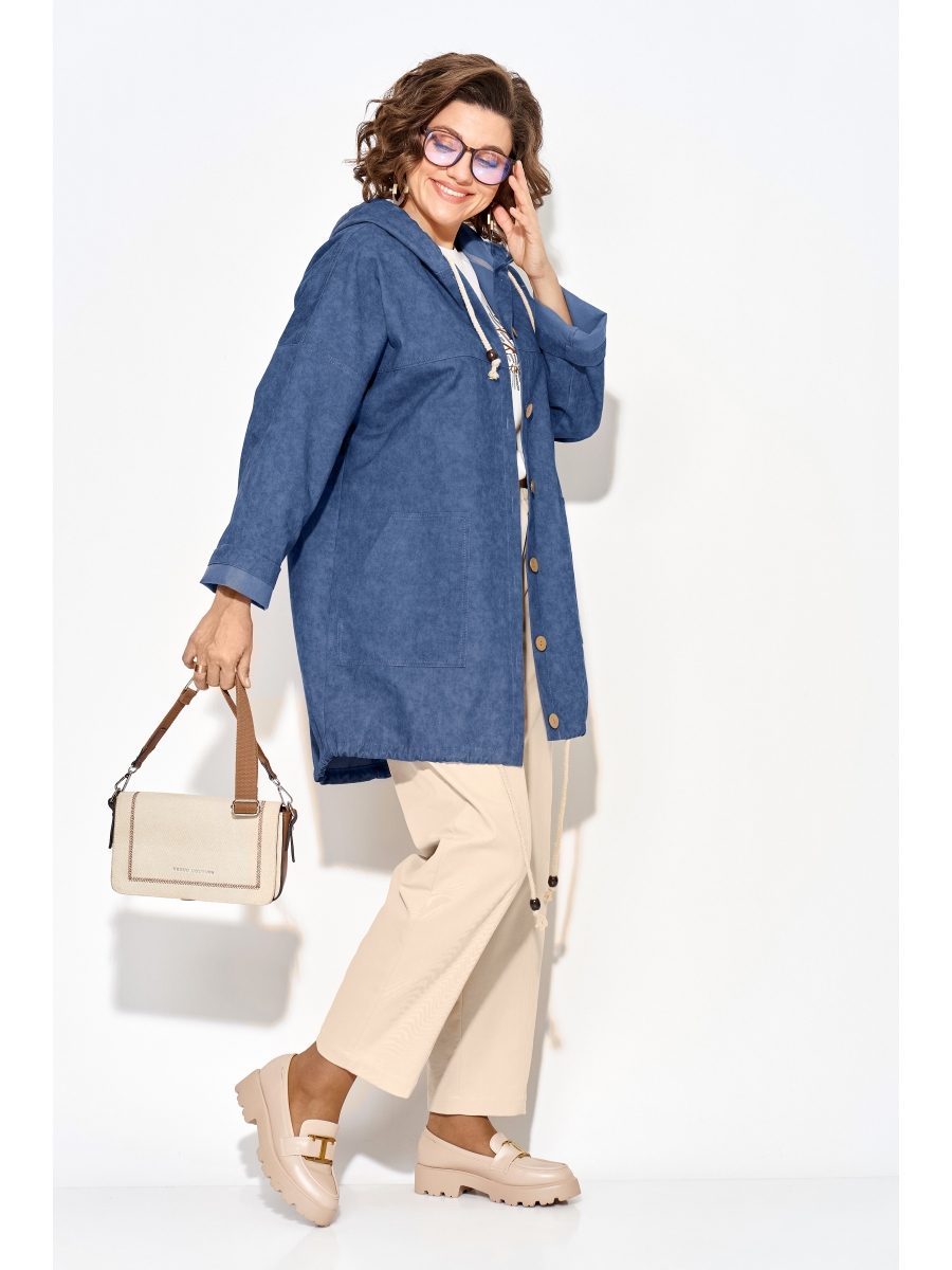 Женская джинсовая парка-ветровка, выполнена из 100% хлопка с эффектом водоотталкивающей пропитки. Удлиненная джинсовка силуэта оверсайз очень практична и удобна, смотрится необычно и элегантно. Модель с объемным капюшоном является очень популярной в предстоящем сезоне. Застежка центральная на петли и пуговицы. Рукав длинный на спущенном плечевом поясе обеспечивает идеальную посадку по фигуре. По полочке расположена кокетка и накладные карманы с отделочными строчками. Спинка с центральным швом, переходящим в разрез. Низ изделия фигурный с утяжкой на шнуровку с наконечниками.