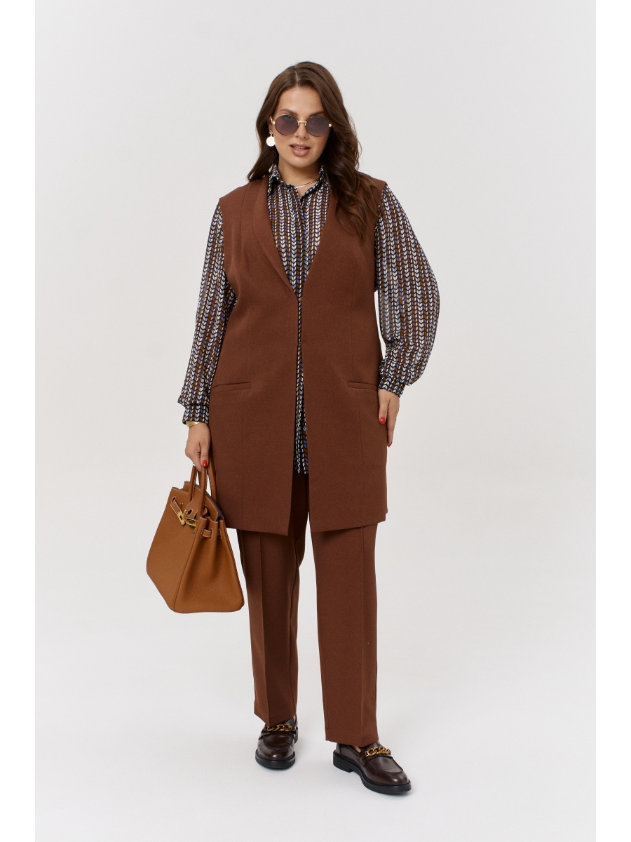 Удлинённый жилет с V-образным вырезом на подкладке прямого кроя выполнен из костюмной ткани, имеет удобные функциональные карманы, что добавляет практичности. Жилет с ассиметричными бортами, с застежкой на крючки по переду, и на регулируемые пуговицы по спинке. По бокам глубокие разрезы с уменьшением полочек, что визуально вытягивает фигуру и делает его комфортным для повседневного ношения как в офис, так и на другие мероприятия.