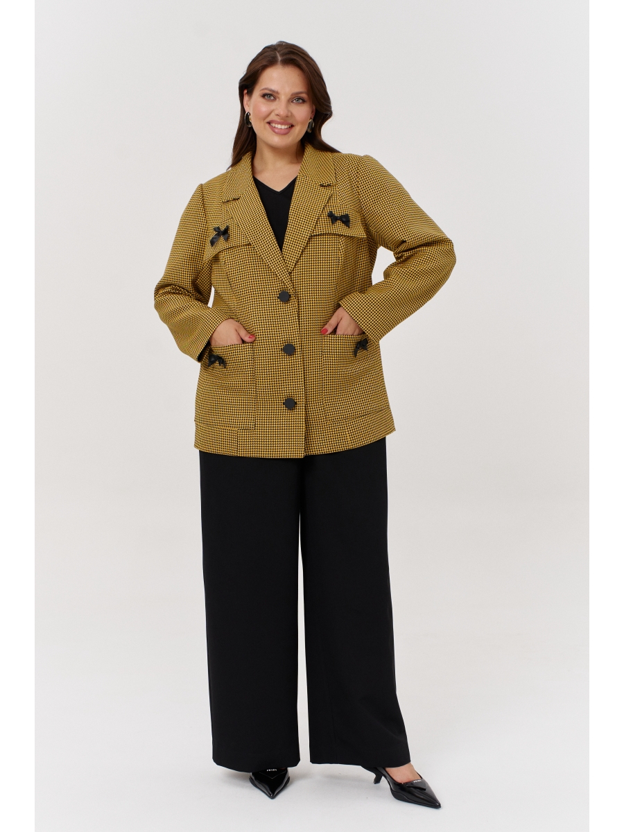 Жакет oversize, однобортный, прямого силуэта на подкладке. Актуальный дизайн «гусиная лапка» не оставит равнодушной ни одну модницу. Отложной воротник с V-образным вырезом скроет несовершенства и визуально вытянет силуэт, сделает образ модным и стильным. Рукав втачной, двушовный, полномерный по обхвату. На полочках накладные карманы. На накладных карманах декоративные элементы - бантики контрастного цвета. Спинка с центральным швом.