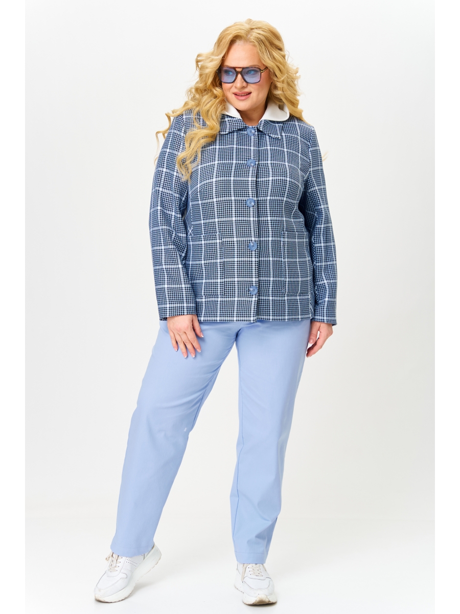 Жакет в клетку oversize, однобортный, прямого силуэта на подкладке с накладными карманами. Отложной воротник и съемный капюшон контрастного цвета сделает образ модным и стильным. Рукав втачной, двушовный, полномерный по обхвату. На полочках накладные карманы. Брюки с высокой посадкой, частично на резинке, с молнией, а также центральной застежке на петлю-пуговичку.