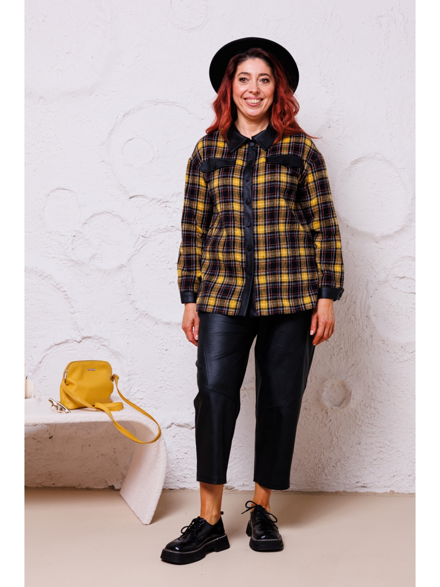 Рубашка прямого силуэта со спущенной линией плеча. Застежка центральная на петли-пуговицы. Перед с накладными клапанами и пришивной пуговицей. Спинка со встречной складкой для свободы движения. Рукав втачной, двухшовный с притачной манжетой, застегивающейся на пуговицу. Воротник отложной рубашечного типа. Низ разноуровневый с фигурными разрезами по бокам. Рубашка без подкладки из мягкой ткани на хлопковой основе, отделка из экокожи.