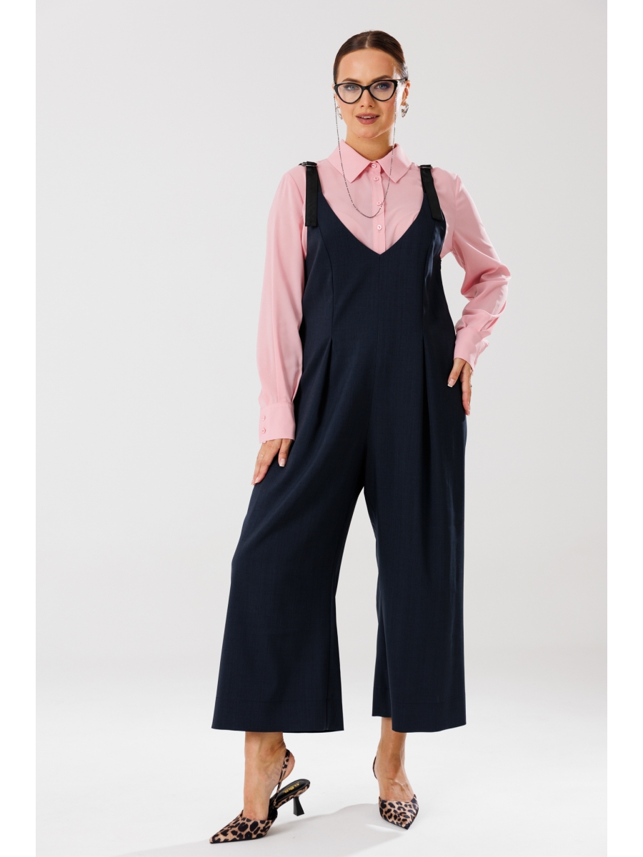 Комбинезон полуприлегающего силуэта, выполненный из костюмной ткани (тянется). По переду рельефные швы, переходящие в односторонние складки. По спинке средний шов. Застежка на потайную тесьму-молнию в левом боковом шве. По боковым швам – функциональные карманы. Горловина V-образной формы. Верх комбинезона оформлен декоративными бретелями из кожи, застегивающимися на полукольца.