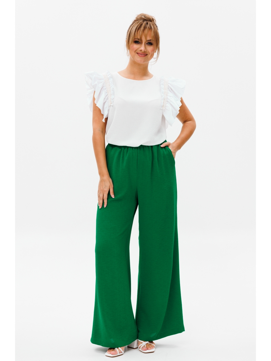 Брюки прямого свободного кроя с высокой посадкой. В боковых швах наклонные карманы. Верхний срез оформлен поясом с эластичной резинкой.