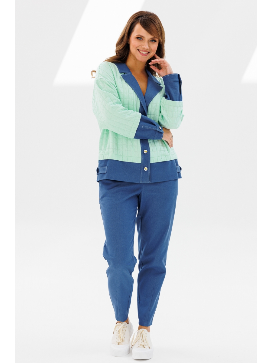 Жакет прямого силуэта со спущенной линией плеча, выполненный из двух видов ткани: стежка (не тянется) и джинсовой ткани (тянется). По переду отрезные планки, центральная застежка на петли-пуговицы. Низ оформлен отрезными планками с отделочными патами на петли и пуговицы. Горловина оформлена воротником пиджачного типа с лацканом. Рукава одношовные, с подрезом в нижней части, по низу с притачной ланжетой, застегивающейся на пуговицы. Жакет без подкладки.