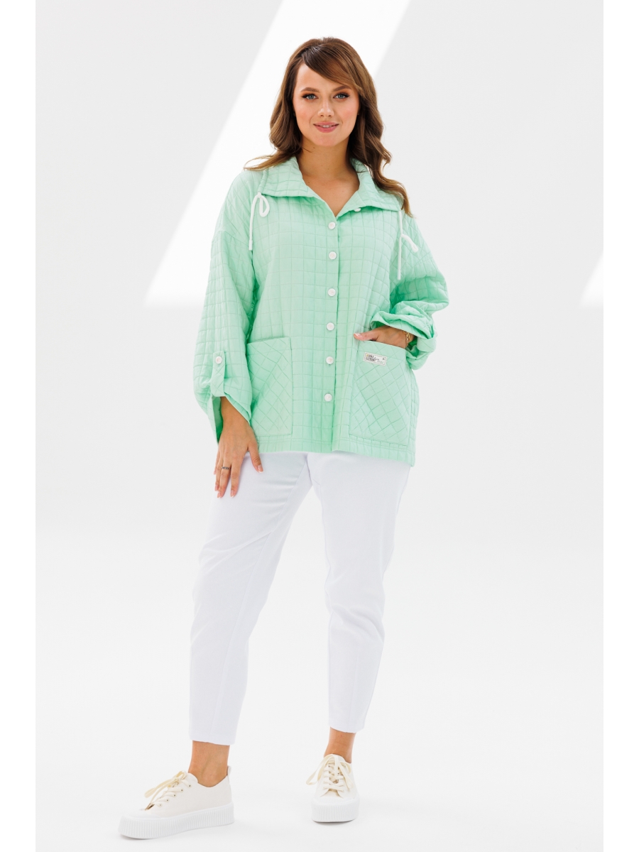 Жакет прямого силуэта со спущенной линией плеча, выполненный из костюмной ткани (не тянется), имитирующей стежку. По переду накладные карманы, центральная застежка на петли-пуговицы. Горловина оформлена рубашечным воротником с кулисой, с отделочным шнуром. Рукава одношовные, длину можно регулировать при помощи паты. Левый карман декорирован пришивным лейблом. Жакет без подкладки.