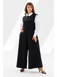 Комбинезон свободного прямого силуэта, выполненный из костюмной ткани (немного тянется). По переду средний шов. По спинке – декоративная металлическая молния в среднем шве. Горловина округлой формы. По боковым швам отрезные ластовицы и функциональные карманы.
