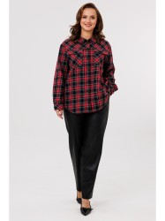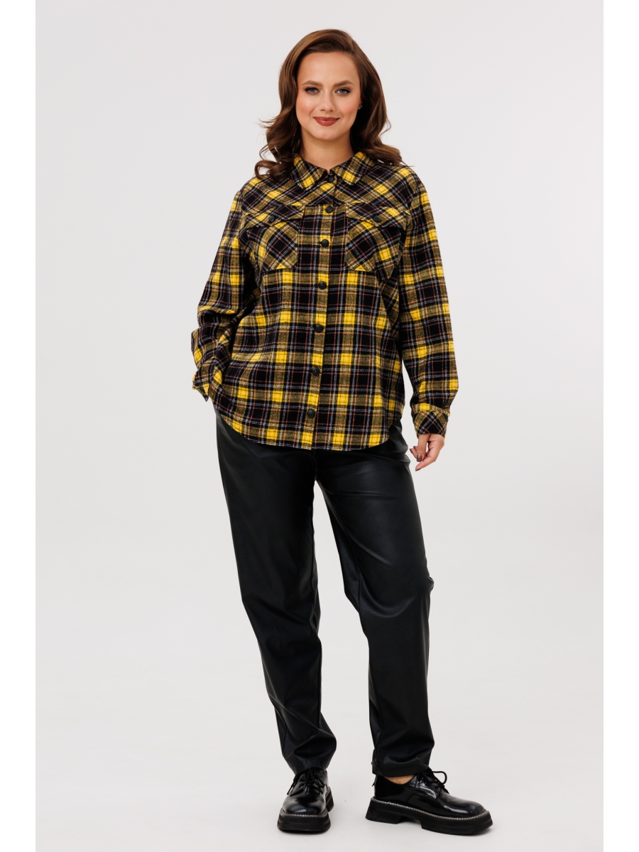 Рубашка прямого силуэта со спущенной линией плеча, выполненная из костюмной ткани в клетку (не тянется). По переду отрезные кокетки, в шов которых вставлен клапан, накладные карманы. Застежка центральная на петли-пуговицы. Спинка с отрезной кокеткой. Рукава втачные, двухшовные, по низу с притачной манжетой, застегивающейся на пуговицы. Воротник отложной рубашечного типа. Низ округлой формы.