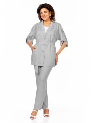 Жакет свободного силуэта имеет спущенную линию плеча и съёмный мягкий пояс, что придаёт ему непринуждённый и расслабленный вид. Застёжка центральная бортовая на три петли и пуговицы. На переде обработаны кокетки, нагрудные вытачки, накладные карманы, прорезные карманы с листочками. Спинка с кокеткой и средним швом. В боковых швах обработаны разрезы. Рукав втачной, длиной ниже локтя, присобран патой. Горловина обработана английским воротником.