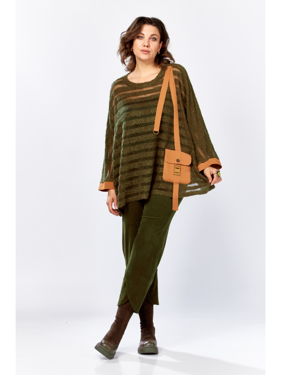 Блуза (пончо) свободного кроя из ткани букле с сеткой. Рукав цельнокроеный типа «летучая мышь», на манжетах из отделочной ткани. По переду с левой стороны настрочен карман с клапаном из отделочной ткани, плюс две декоративно настроченные полоски. Спинка цельная. Горловина круглая, обработана планкой.
