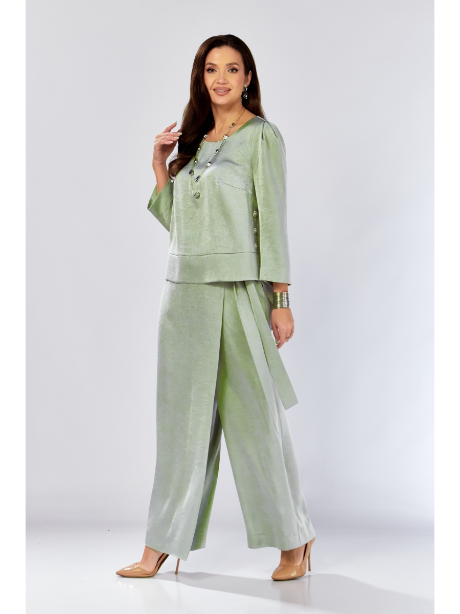 Этот костюм - воплощение вечерней элегантности. Мягкий крэш-сатин фисташкового оттенка струится при движении, играя бликами в каждом шаге, добавляя образу глубины и роскоши.