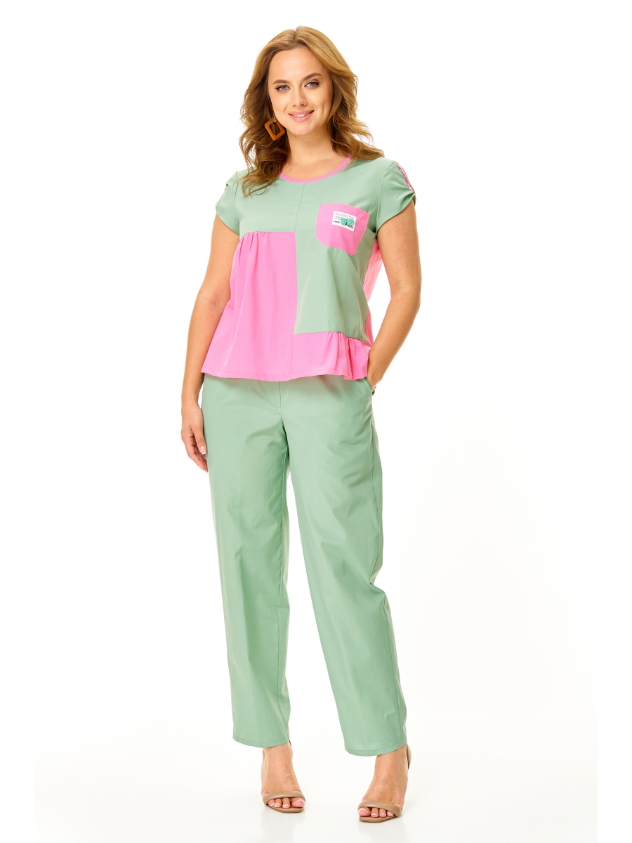 Легкий летний комплект состоит из блузки и брюк в сочетании цветов яркой розы и нежной мяты.