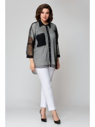 Рубашка удлиненная, свободного кроя. Застежка-планка с прорезными петлями на пуговицах. Спинка свободного кроя без талиевых вытачек. По центру спинки кокетка. Воротник рубашечного типа. Низ изделия с фигурными вырезами по боковому шву. Линия плеча спущенная, рукав притачной, по низу рукава манжет с застежкой на пуговицу. Есть накладной карман.